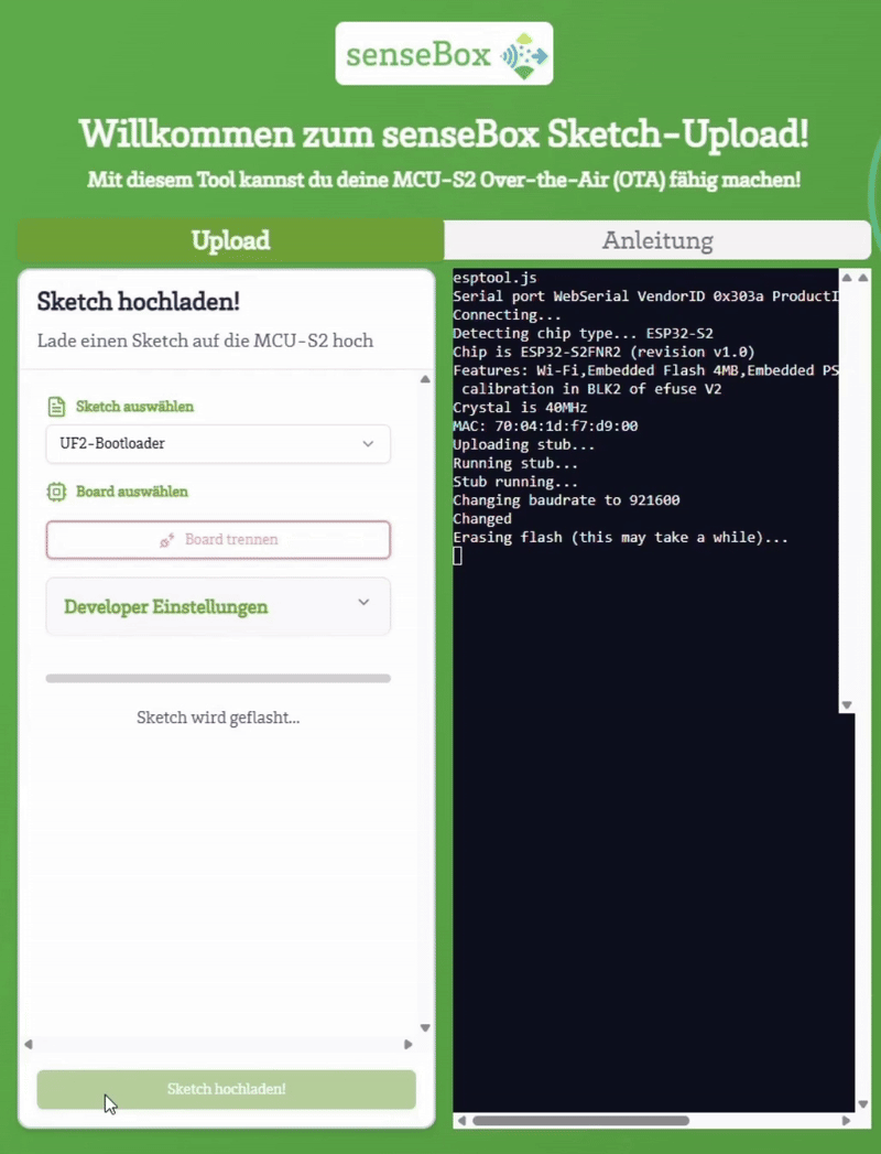 Sketch hochladen!um den Bootloader zu flashen. Der Prozess kann einige Minuten dauern. - Drücke den Reset-Button auf der senseBox MCU-S2, um den Bootloader zu starten.