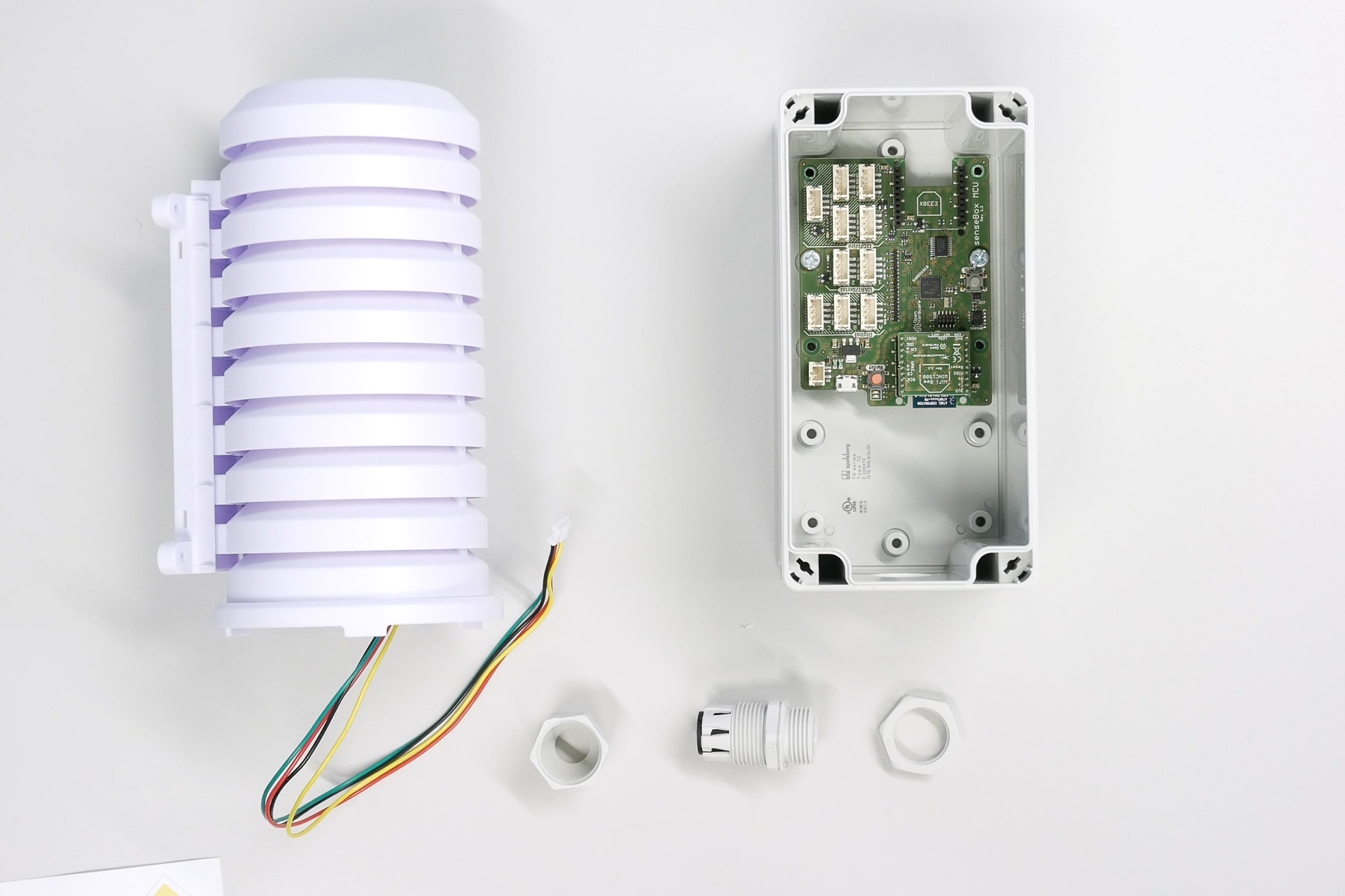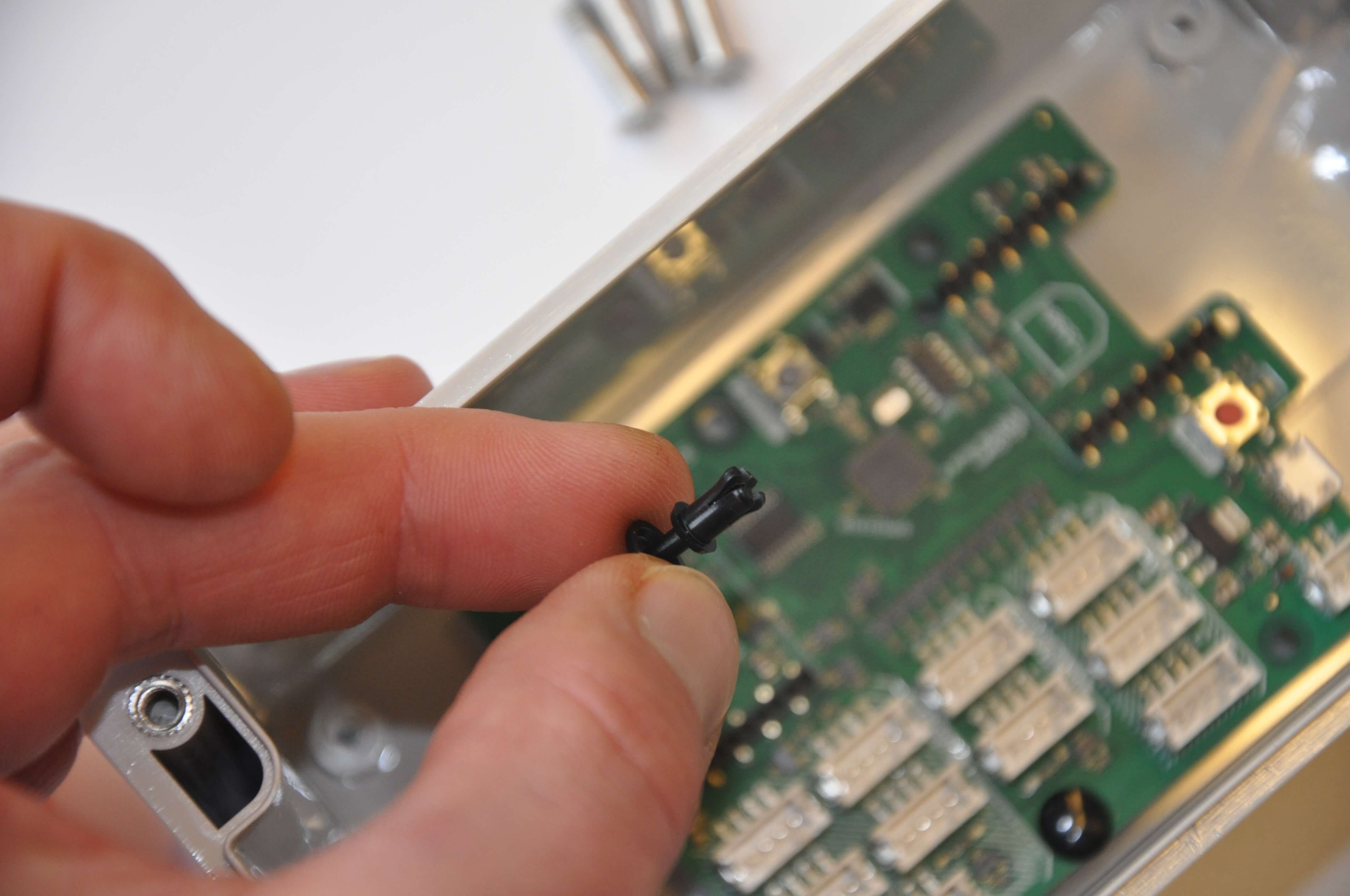 Dann wird die Montageplatte auf die Abstandshalter gedrückt und die Kabel mit den Sensoren verbunden. Die Sensoren werden mit jeweils zwei Abstandhalter ausgestattet und auf der Montageplatte befestigt. Hast du einen Lichtsensor gewählt, sollte dieser möglichst mittig im Gehäuse angebracht werden, um gute Messwerte zu erhalten. Der Luftdruck-Sensor kann in den äußeren Steckplatz.