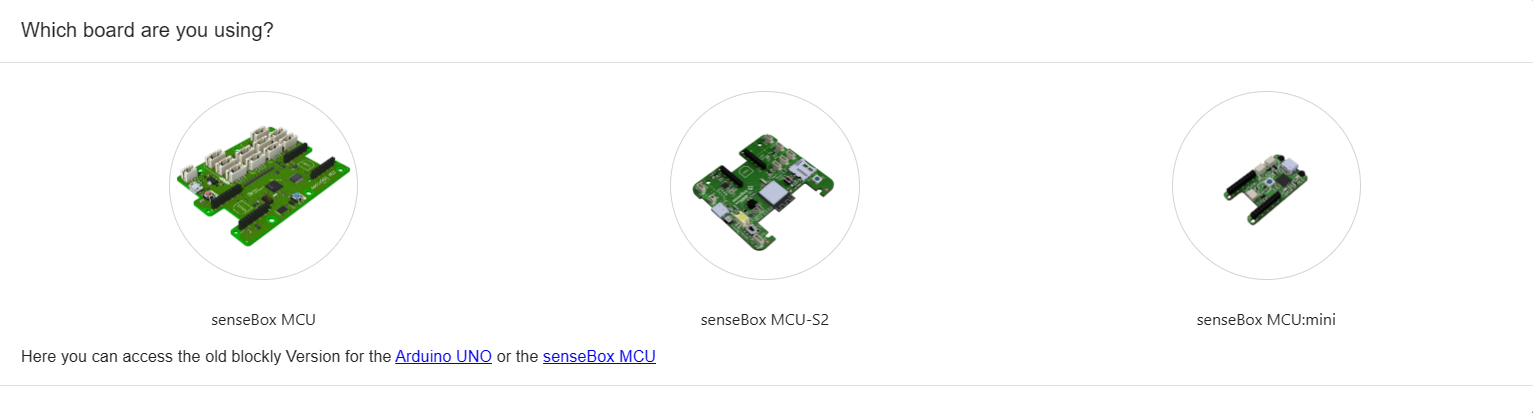 Open Blockly for senseBox in your browser by visiting https://blockly.sensebox.de. The first thing you will see is a selection of senseBox versions. Choose the version you are using.