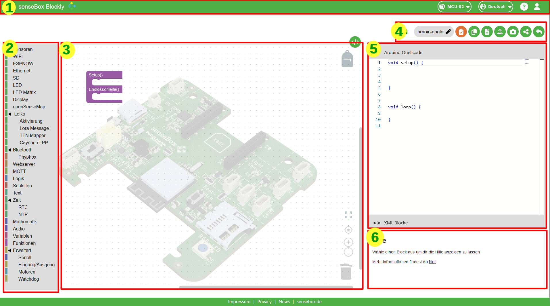 Once you have selected your senseBox version, you will see the Blockly interface, which can be divided into six sections.