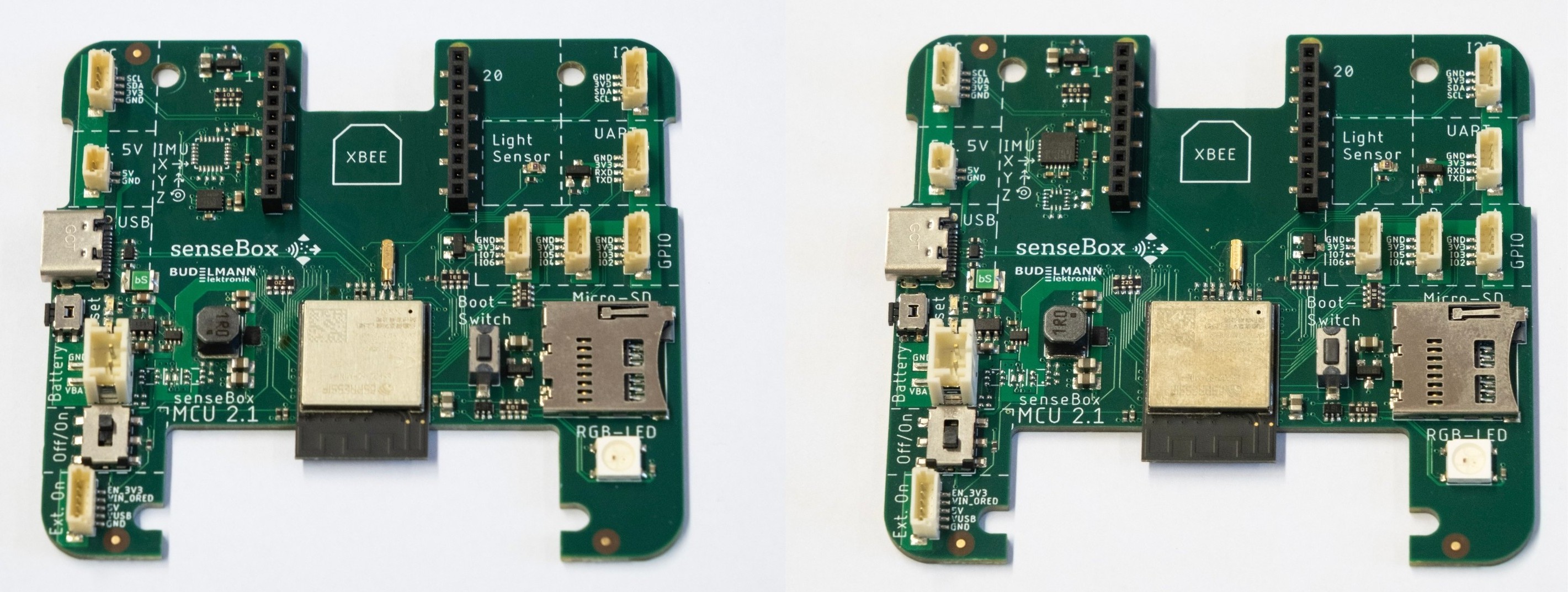 Die Revision 2.1 ist die erste käuflich erwerbbare Version der senseBox MCU S2. Von dieser Revision wurden zwei Versionen in limitierter Auflage veröffentlicht. Zum Zeitpunkt der Entwicklung war noch nicht klar wie sich der Markt für Halbleiter nach der Corona-Krise weiterentwickelt. Daher wurden zwei Version mit unterschiedlichen Lage- und Beschleunigungssensoren veröffentlicht. Der folgende Slider zeigt die beiden Versionen der Revision 2.1.
