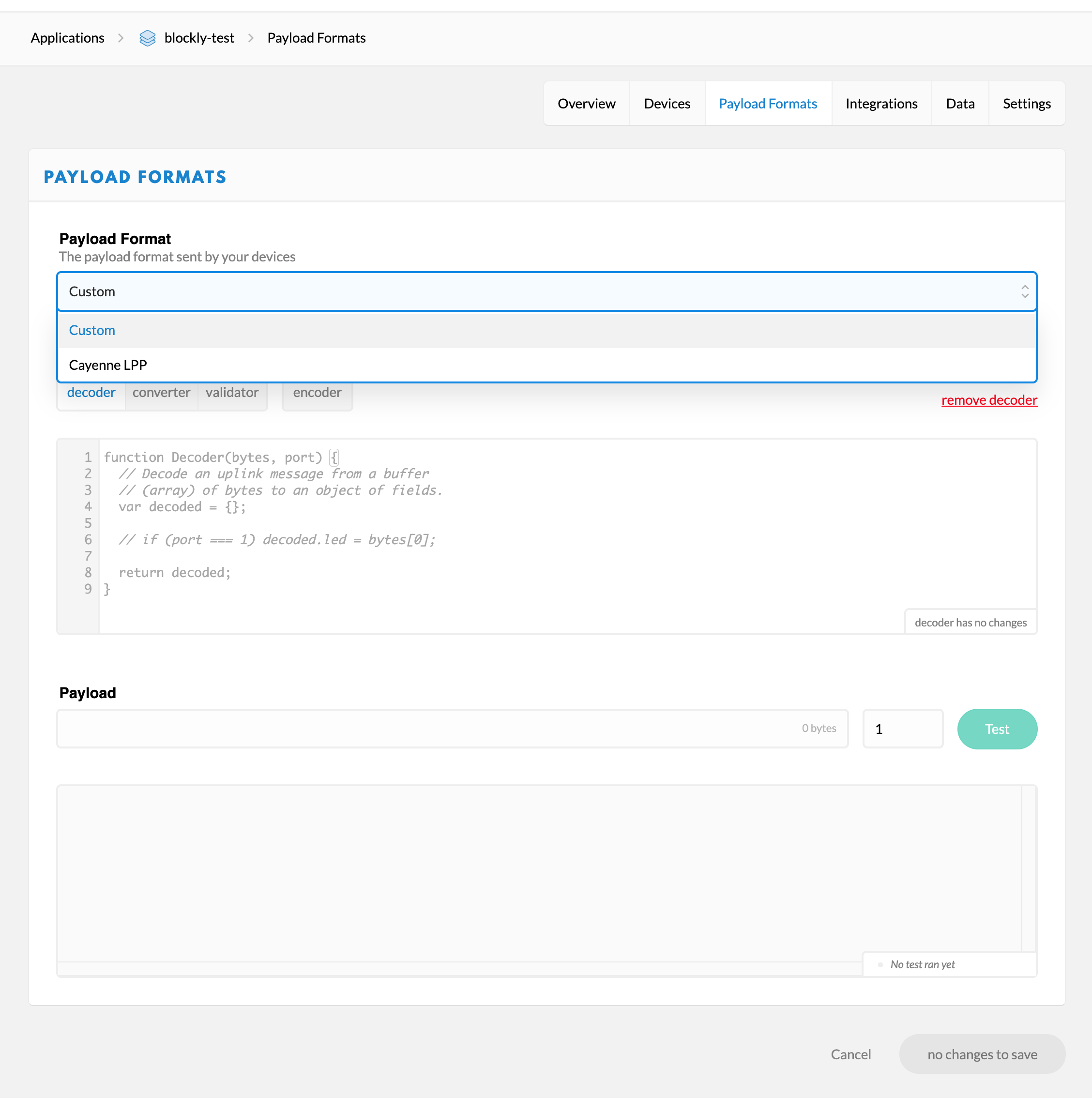 Use these blocks to send a message over the LoRa network. No specific format is used for the message (often called payload). The data is encoded as bytes, allowing for quick and efficient transmission over the LoRa network. The data must then be converted back into a readable format using a special decoder in the TTN Console.