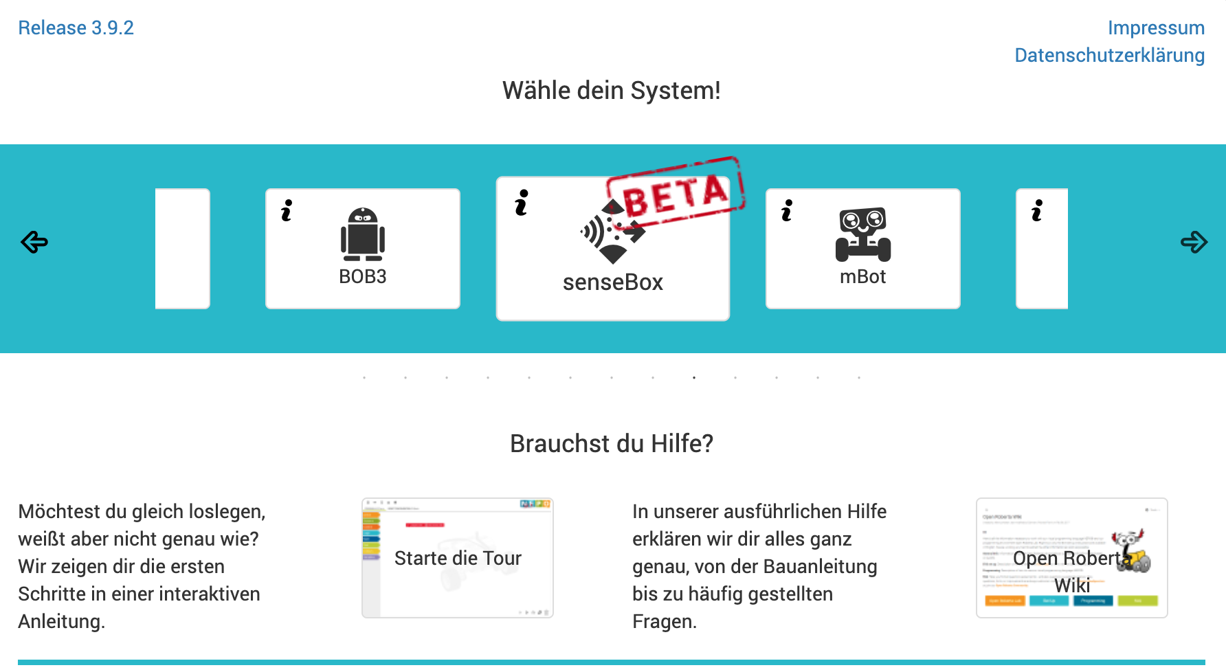Open the Open Roberta Lab at lab.open-roberta.org. There, you first need to select your system, which is the senseBox.